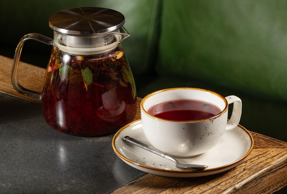 Черный чай, мята, лимон, черника, черничный сироп, малиновое пюре