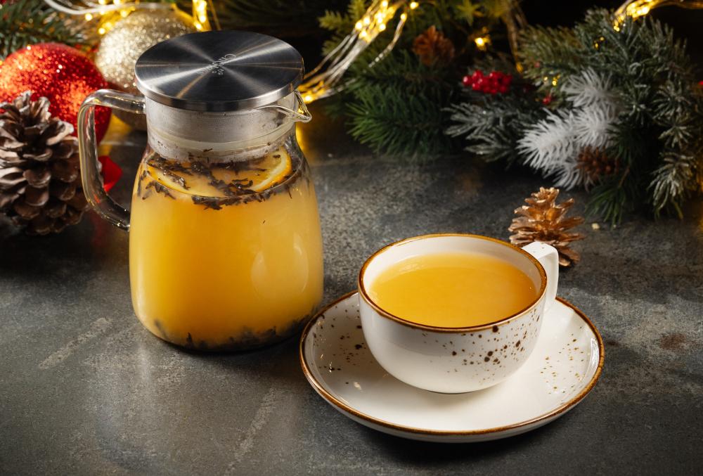 Черный чай, апельсин, имбирь, апельсиновый сок, гвоздика, анис, ванильный сироп