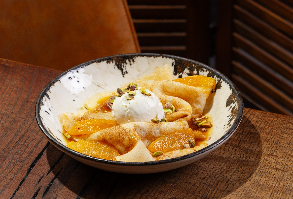 Блины с карамелью Сюзетт, дольками апельсина и шариком пломбира