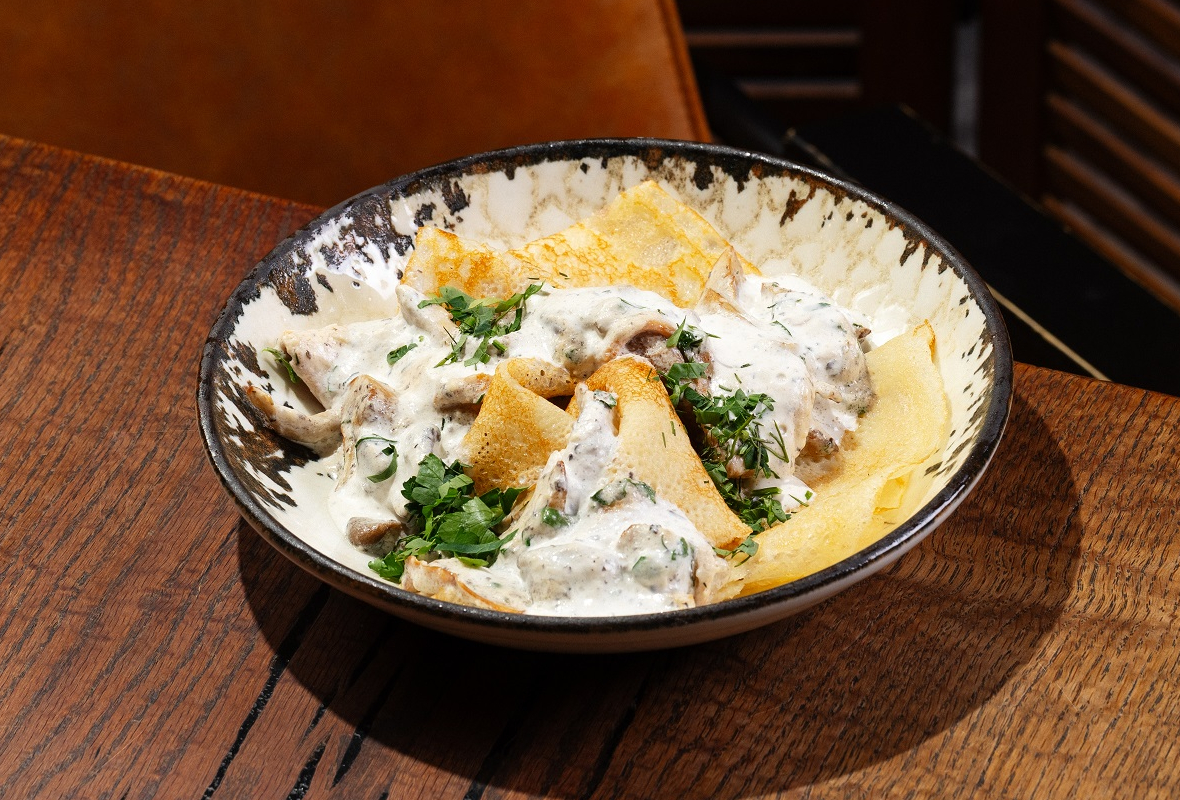 Блины с маслом, вешенки, шампиньоны, белые грибы, трюфельная паста, сыр фета, сливки, индейка